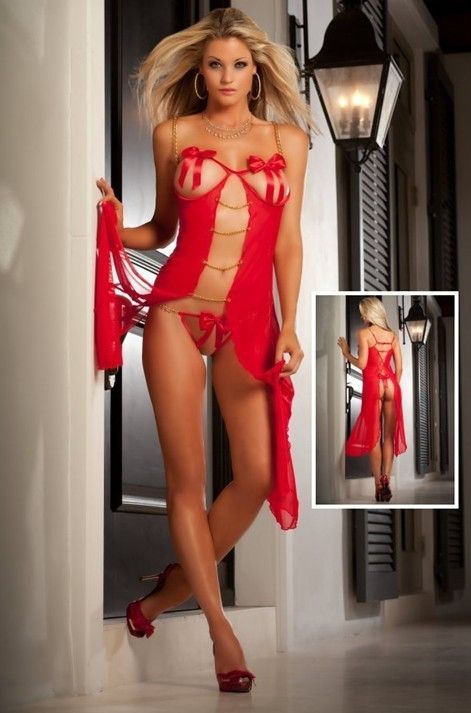 Открытое длинное платье выполнено из лёгкого материала красного цвета. Все интимные части вашего прекрасного тела в этом платье будут открыты и украшены красными бантиками. Между частями платья имеются соединительные цепочки. Длина платья чуть ниже колена.