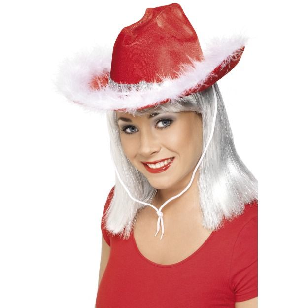 Ковбойская новогодняя шляпа выполнена в красном цвете. Поля шляпы украшены белым пушистым марабу и серебрянной тесьмой. У шляпы имеется белый шейный шнурок.