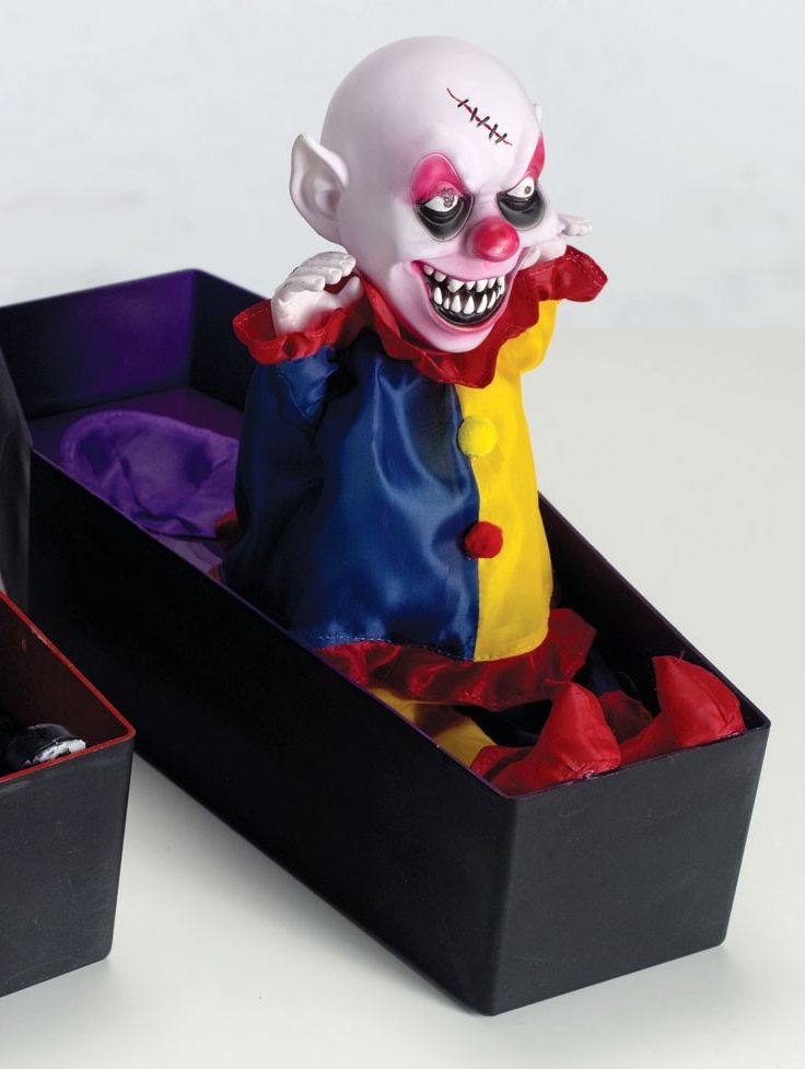 Восстающий из гроба клоун - это жуткая, но в тоже время забавная декоративная фигурка, которая представляет собой черный гроб с лежащим в нем ужасным клоуном. Клоун с ужасным криком поднимается в гробу, светится и смеется жутким смехом. Размер фигуры около 35 см. В комплекте три батарейки типа АА.