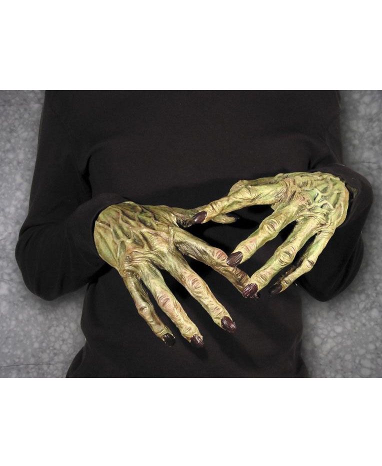 Зелёные руки монстра выполнены из латекса. Эти руки прекрасно дополнят любой костюм монстра или какого-нибудь жуткого существа. Корявые пальцы, чёрные когти и выступающие вены - весьма жутко.