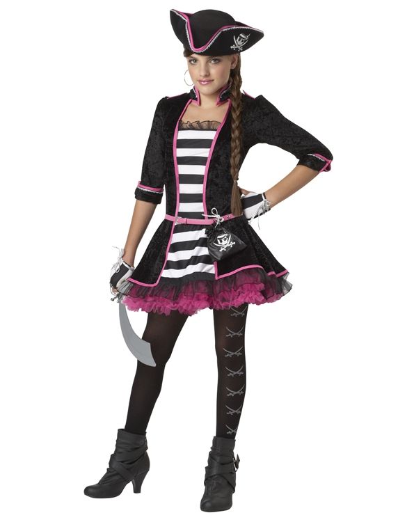 Костюм пиратки открытого моря подходит для активного времяпровождения, ведь открытое море всегда пахнет новым грабежом. В состав костюма входит платье, пиратская шляпа, пояс с кошельком, перчатки, леггинсы с принтом.