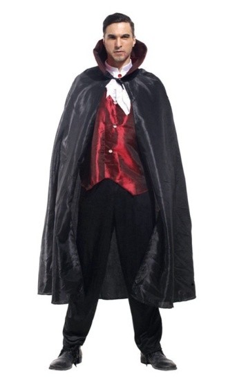 Костюм величественного вампира - беспроигрышный вариант костюма на Хэллоуин. Костюм включает в себя черные брюки, красно-белую рубашку с имитацией жилета и черный плащ с воротником.