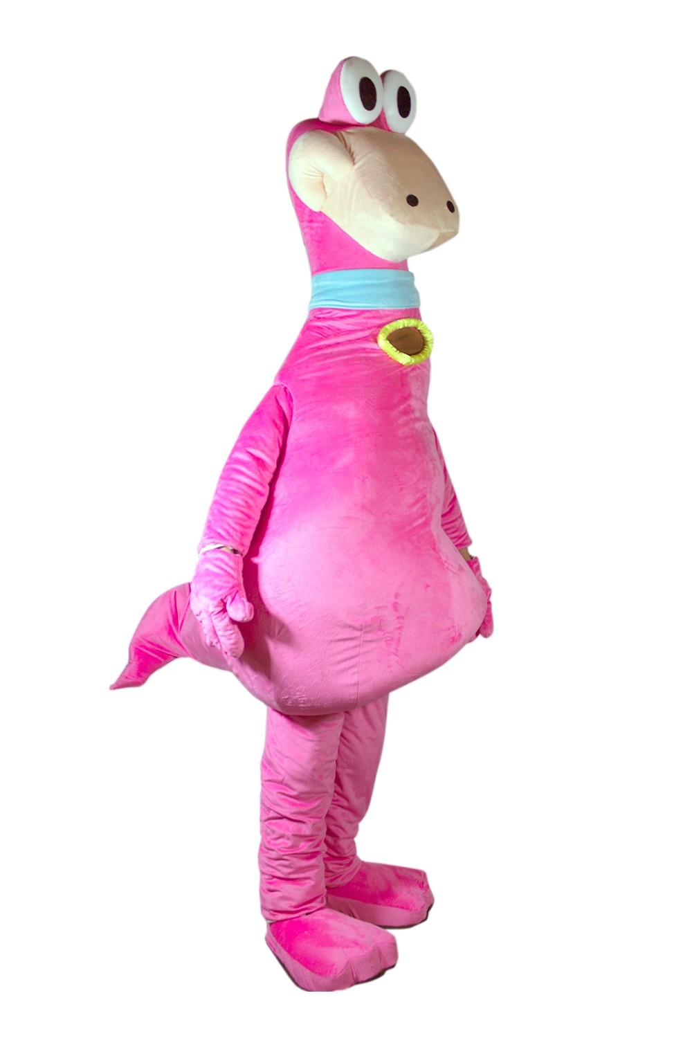 Ростовой костюм Розовый Дино - яркий плюшевый костюм, выполненный в розовом цвете из мягкого приятного материала. В комплекте костюма туника в виде тела Дино в котором имеется сетчатая вставка для глаз. Также имеются розовые брюки, обувь и перчатки.