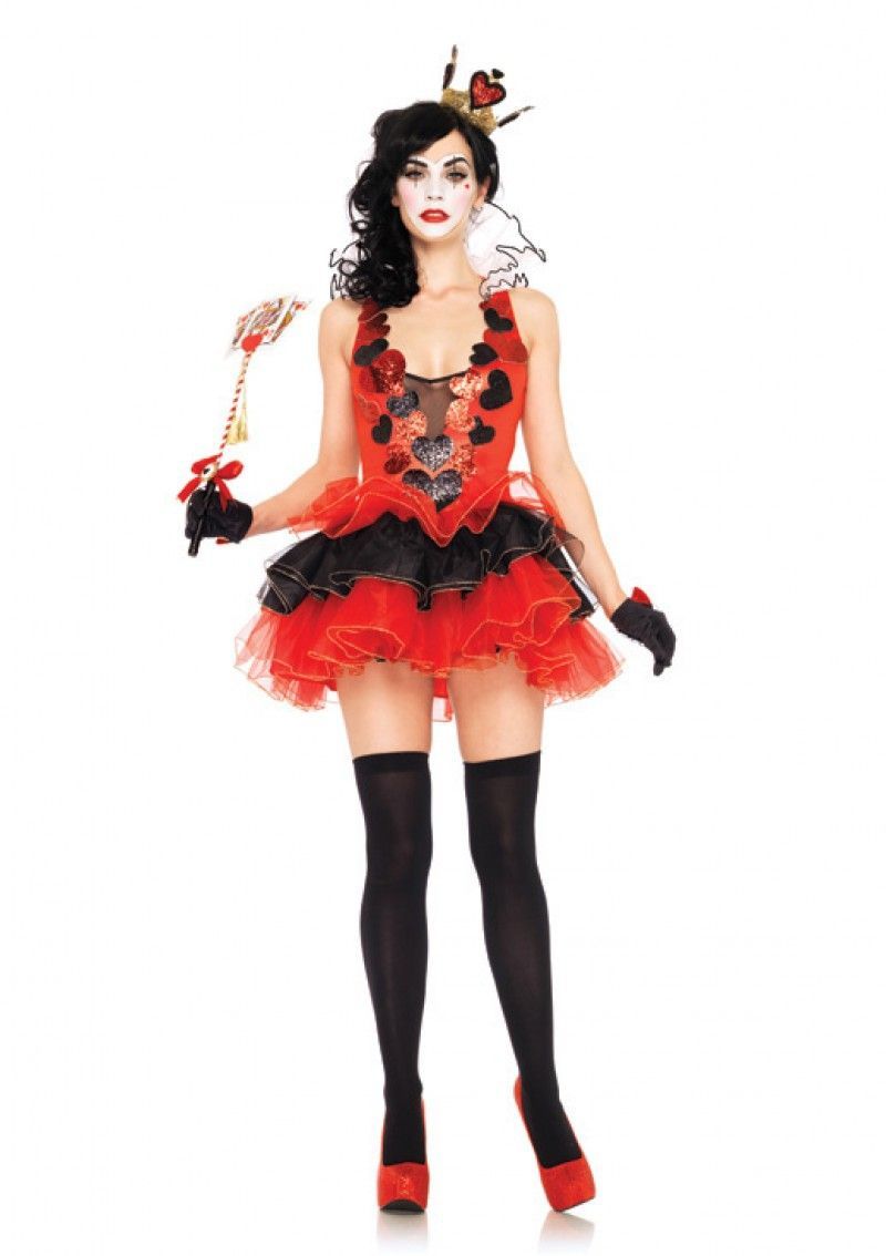 Костюм королевы черных сердец включает в себя красное атласное платье с многослойной юбочкой Туту красно-черного цвета. Верхняя часть платья украшена черными и красными сердечками. Сзади на спине имеется сетчатая вставка в виде сердечка. К платью прилагается корона.