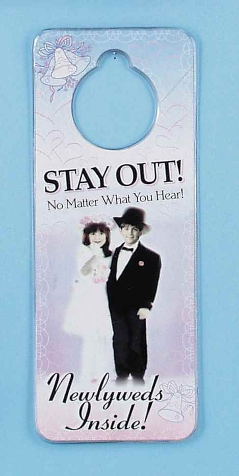 Табличка на ручку двери Новобрачные выполнена в светлых тонах с черными надписями и изображением жениха и невесты.