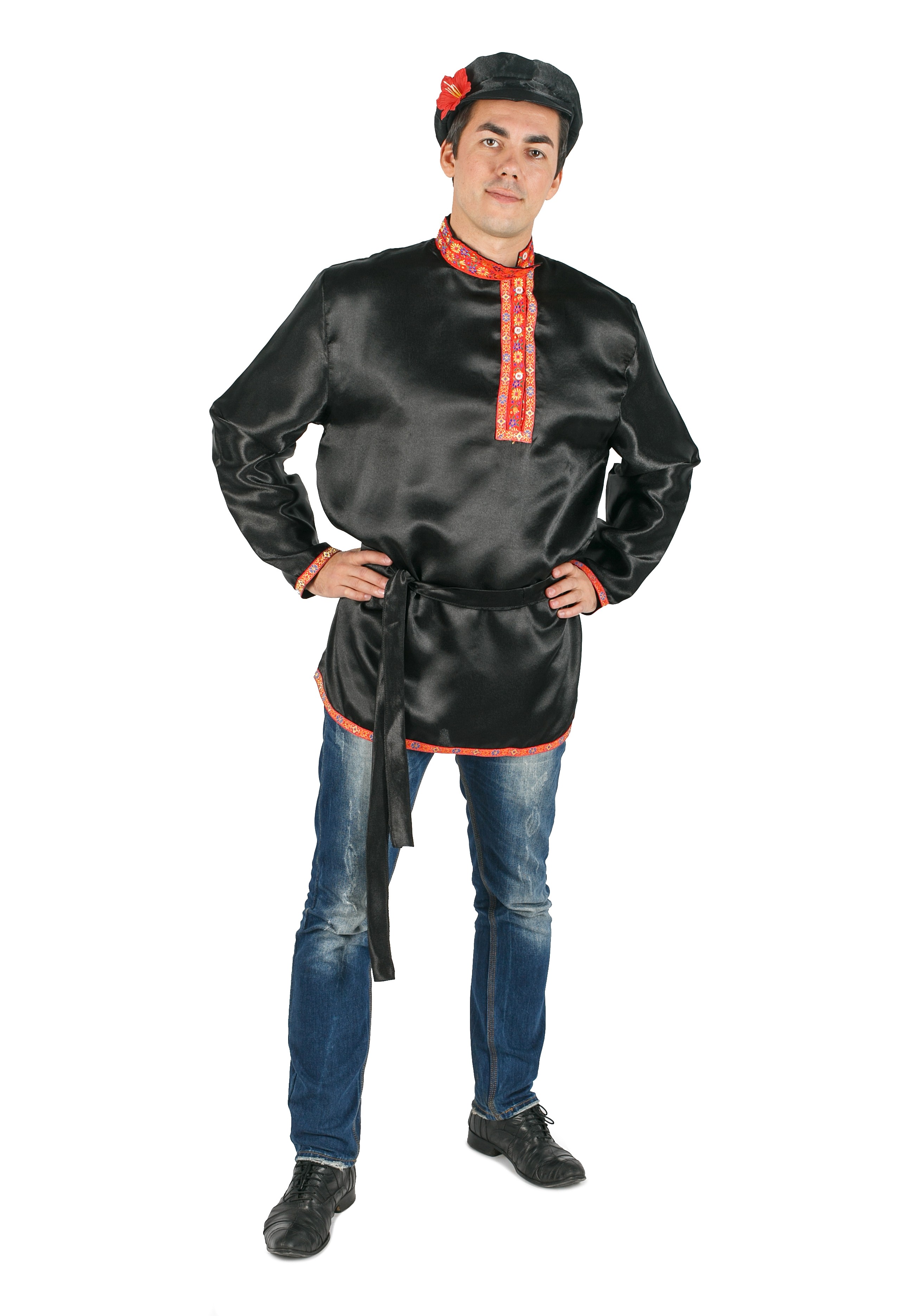 Косоворотка атласная черная - отлично подойдет для создания русского народного образа. Косоворотка выполнена из атласного черного материала. Воротничок и подол с отделкой из красной тесьмы. Также к ней прилагается черный атласный пояс.