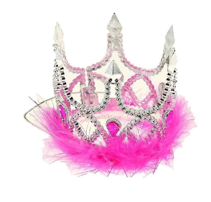 Корона принцессы представляет собой головной убор серебристо-розового цвета, украшенный камнем в виде капельки. Корона поможет дополнить образ королевских и придворных особ. Корона изготовлена из пластика и имеет размер 0,5х8х9 см.