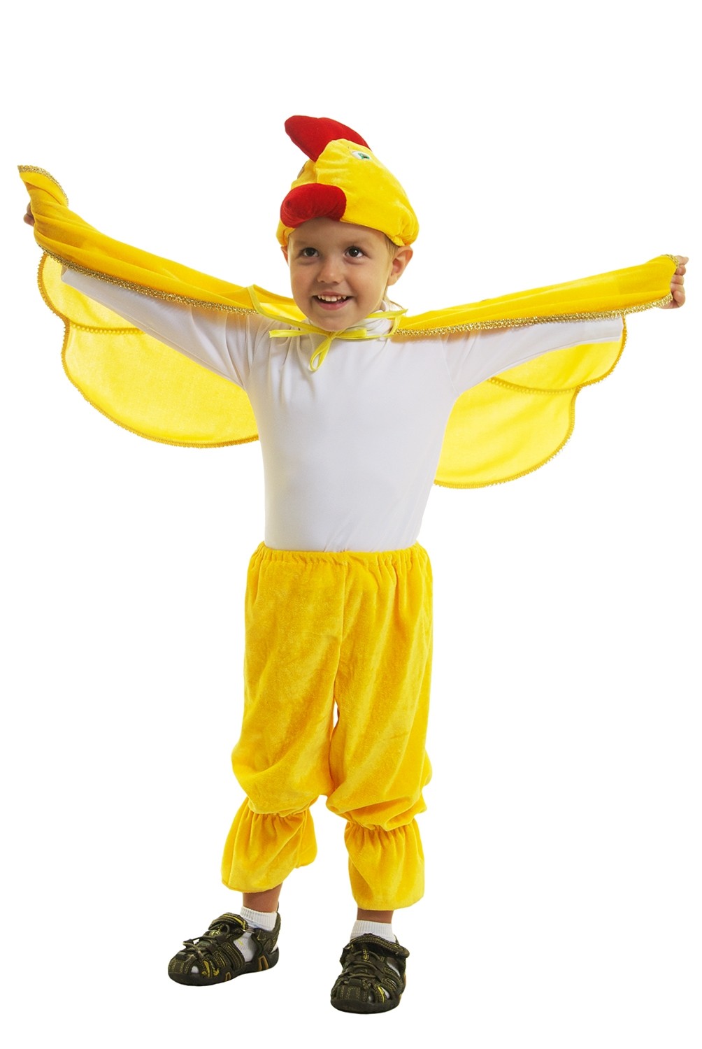 Костюм маленького цыпленка - яркий желтый костюмчик для мальчиков, который включает в себя мягкие штанишки на резиночке, накидку-плащ, выполненную в виде крыльев, а также шапочку-маску в виде мордочки цыпленка с красным клювом и гребешком.