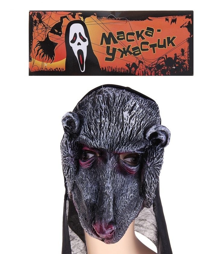 Маска грустной гориллы серого цвета. Маска изготовлена из латекса и имеет размер 20х20 см.
