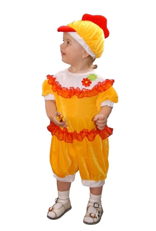 Костюм малыша-цыпленка - плюшевый мягкий костюмчик, который включает в себя желтый комбинезон с красными рюшами и белым воротничком, а также шапочку-маску с красным клювом и гребешком.