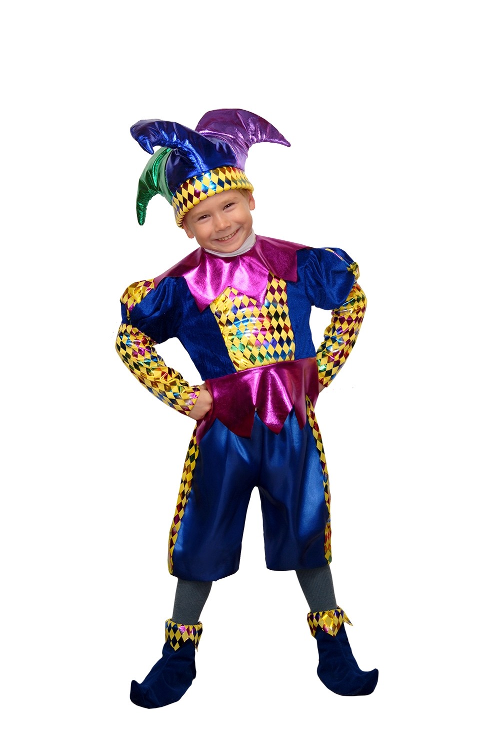Детский костюм королевского шута - яркий атласный костюм для детей, который отлично подойдет для постановки спектаклей. В комплект костюма входит синий камзол с разноцветной вставкой на груди и рукавах, свободные бриджи, текстильные сапожки с закругленными носами, а также яркая веселая шапочка шута.