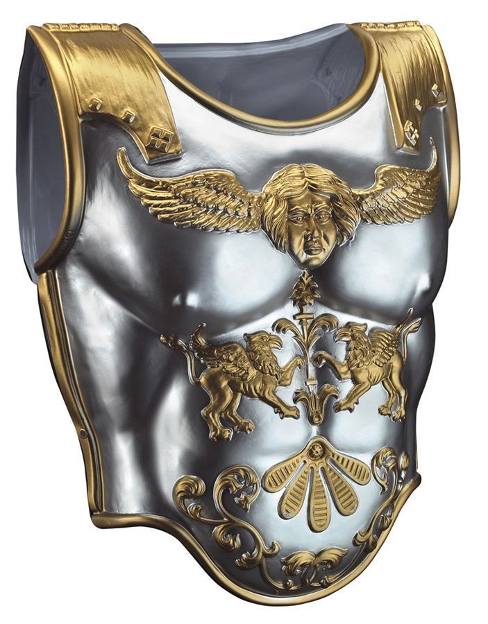 Серебряные доспехи смогут дополнить костюмы рыцарей и другие подобные образы. Доспехи выполнены из лёгкого пластика серебряного цвета с золотой отделкой. На передней части изображено крылатое лицо и два грифона.(Оружие, обувь и прочие аксессуары для дополнения образа вы также найдете в нашем каталоге).Рекомендации по уходу: Только чистка по месту загрязнения.