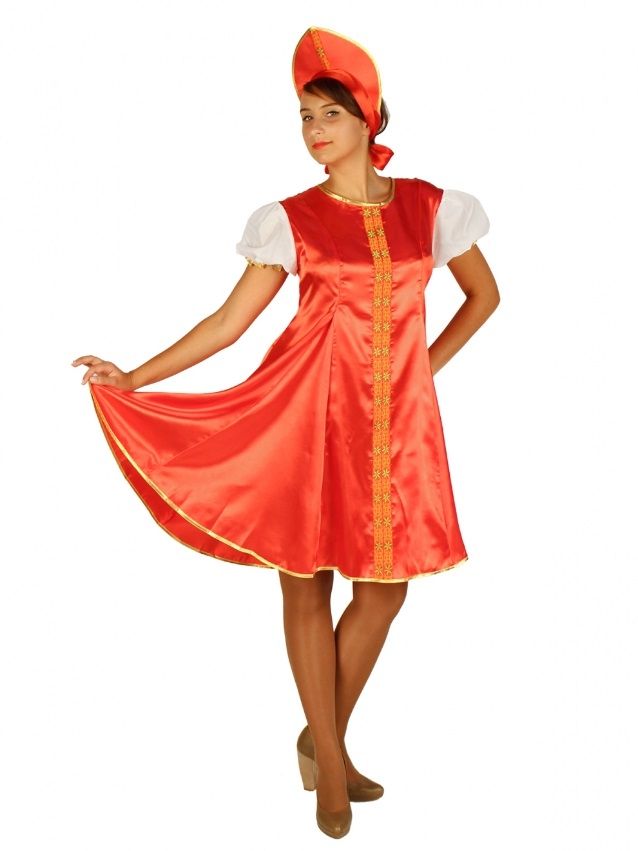 Подростковый костюм Царевны включает в себя яркое красное нарядное платье из атласного материала. Платье украшено золотистой отделкой. Рукава-фонарики. К платью прилагается заостренный кокошник с завязочками из атласной ленты.