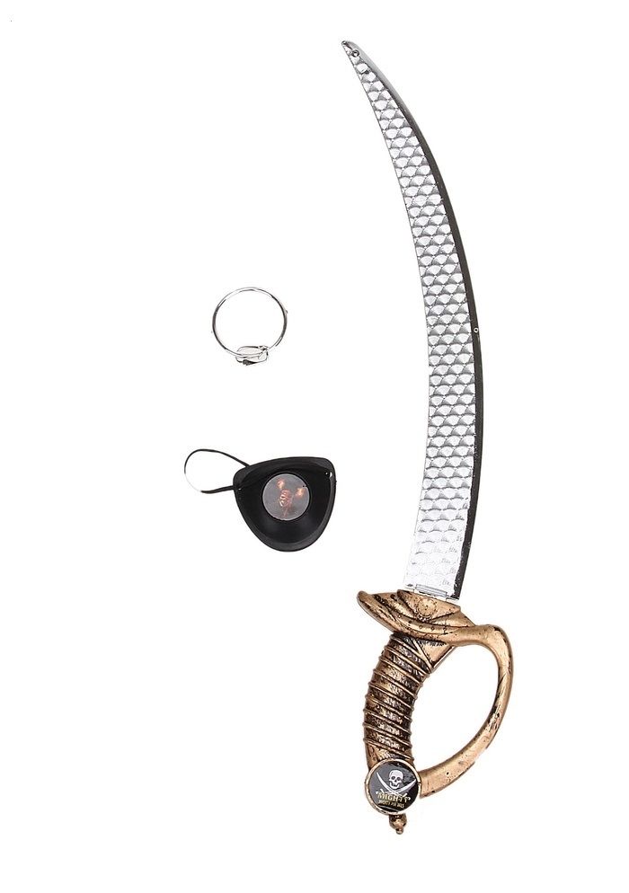 Набор грозного пирата включает в себя повязку на глаз, клипсу и меч с изображением черепа на рукоятке. Размер набора 48х9х1,5 см.