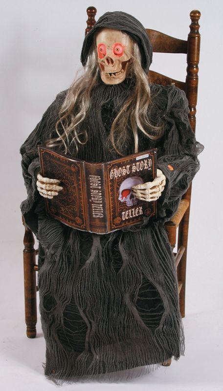 Читающая фигура Смерти выполнена в сидячем положении, она одета в рваную одежду, костлявые руки, череп с длинными волосами в капюшоне. У смерти светятся глаза, двигается челюсть и она умеет разговаривать. Для всех этих действий, вам потребуются 3 батарейки, которые входят в комплект. Высота фигуры составляет 120 см.