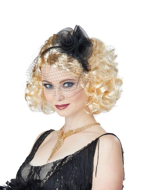 Парик блондинки 20-х годов - короткий кудрявый парик с черным ободком с прикрепленными тканевыми розами и вуалью.