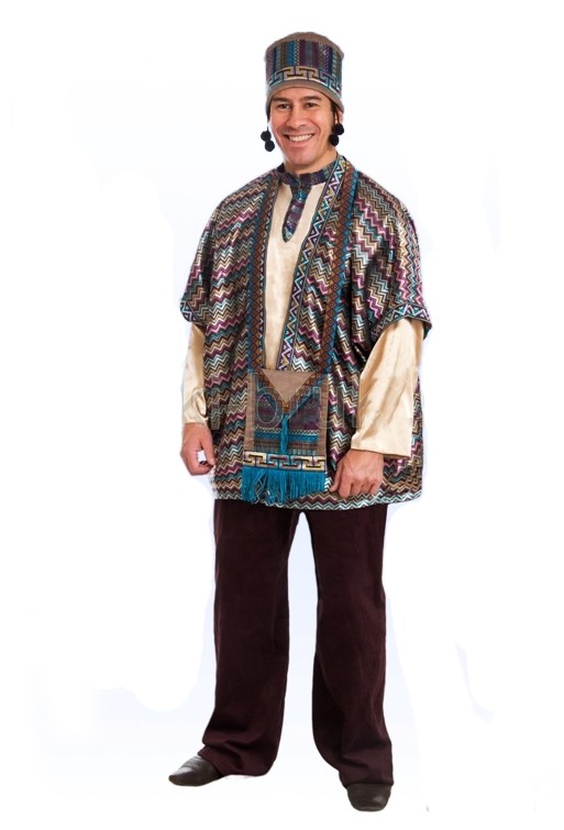 Костюм Африканца - пестрый национальный костюм, который включает в себя коричневые брюки свободного кроя, светло-бежевую тунику с разноцветным воротничком, пестрый разноцветный свободный жилет, сумку в тон, а также национальную цветную шапочку.