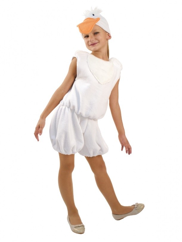 Костюм белого Гусенка выполнен из мехового искусственного материала белого цвета. В комплект входит комбинезон с шортиками, собранный слегка на талии и ногах. Также его дополняет шапочка-маска гусенка с оранжевым клювом.