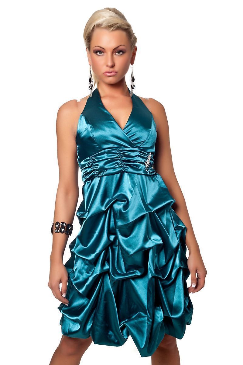 Бирюзовое платье до колен выполнено из блестящего атласного материала. Платье с одной завязывающейся лямкой через шею. Под грудью имеется пояс из сборочек с серебряным украшением. Свободная юбка до колен украшена волнообразными сборками. Сзади платье украшено атласной ленточкой с бантиком.