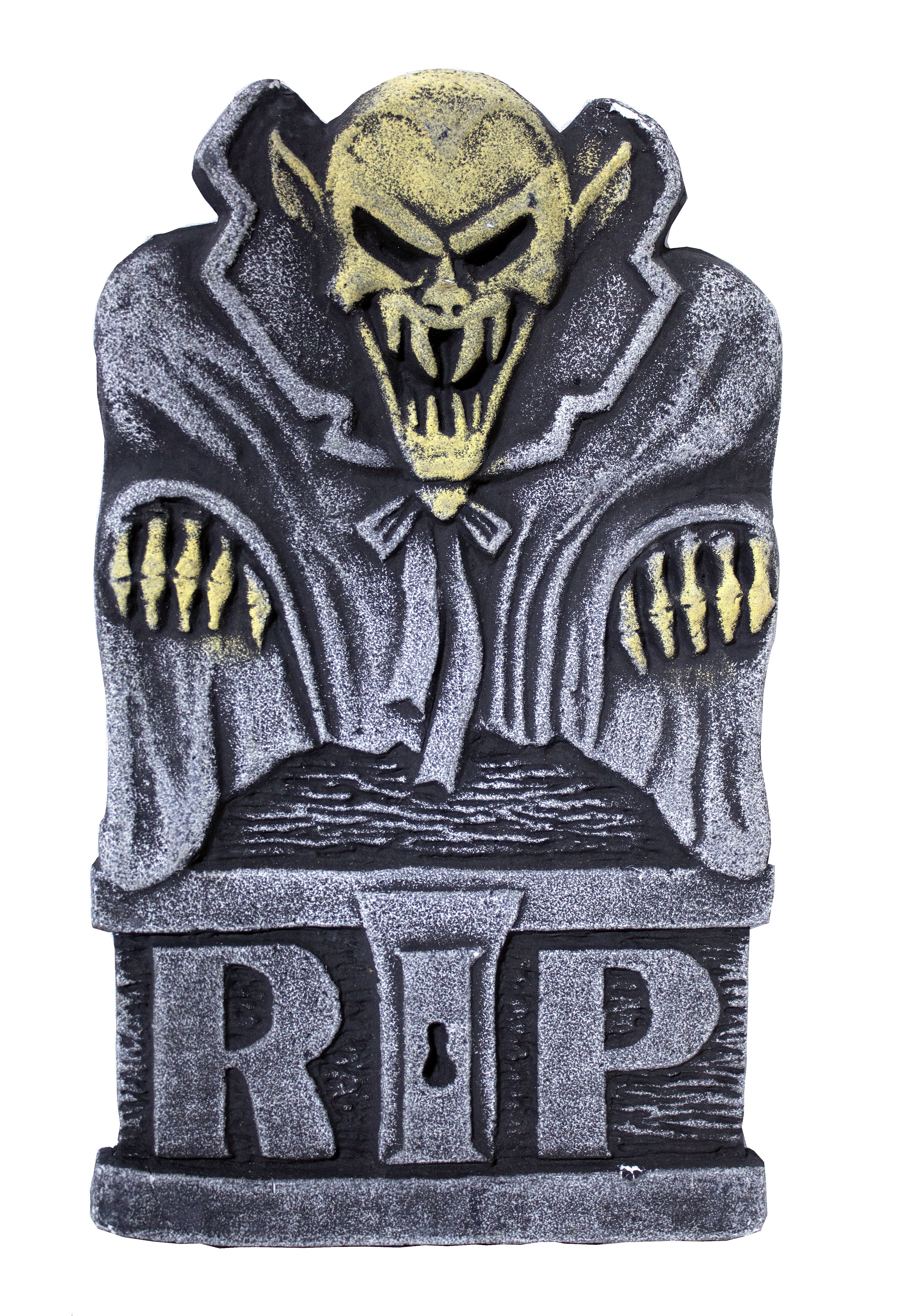 Надгробие с вампиром выполнено из пенопласта серого цвета. Надгробие выполнено в виде вампира в накидке, снизу надгробие дополняет надпись RIP.