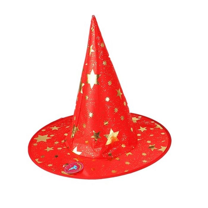 Красная шляпа со звездами - это высокая конусовидная шляпа, выполненная в красном цвете и украшенная золотистыми звездами разного размера. Шляпа отлично дополнит различные костюмы ведьм и волшебников и станет прекрасным аксессуаром для Хэллоуина и других костюмированных вечеринок. Размер 37 × 37 × 35 см.