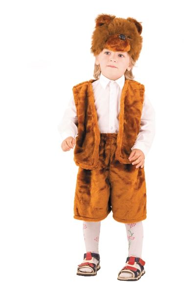 В комплекте костюма медвежонка Топтыжки имеются шортики, жилетка и шапка-маска бурого мишки.