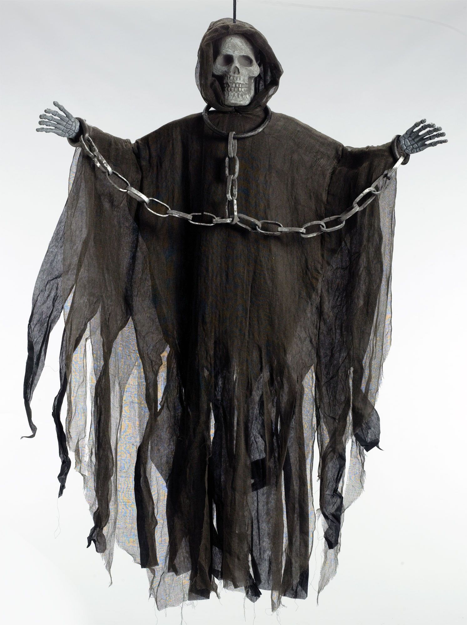 Подвесная фигура серой Смерти Try Me! - это жуткий серый скелет с расставленными руками, который одет в серый рваный плащ. На фигуре есть кандалы, одетые на шею и руки. Такая декорация идеально дополнит помещение для вечеринки в честь Хэллоуина или Пятницы 13.