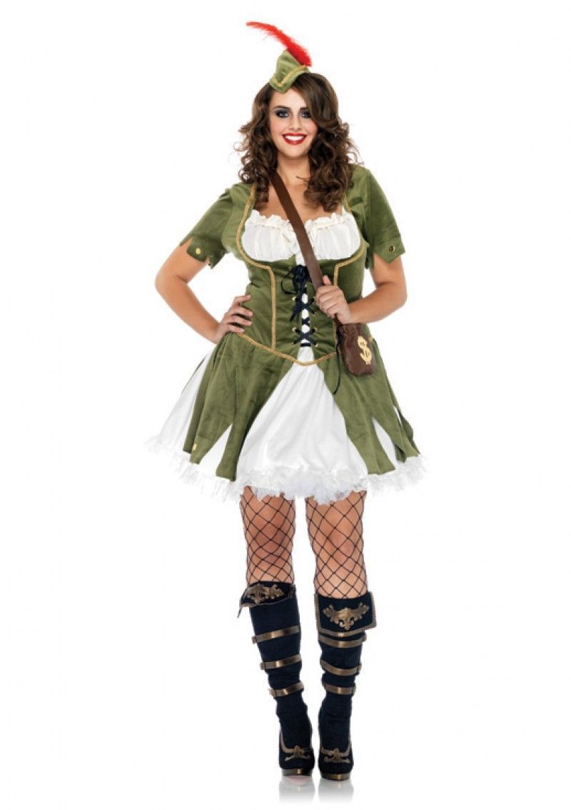 Костюм девушки Робин Гуда XL включает в себя оливковое платье с белыми вставками и черной шнуровкой спереди, небольшую шляпку с красным пером и коричневую сумочку с изображением доллара.