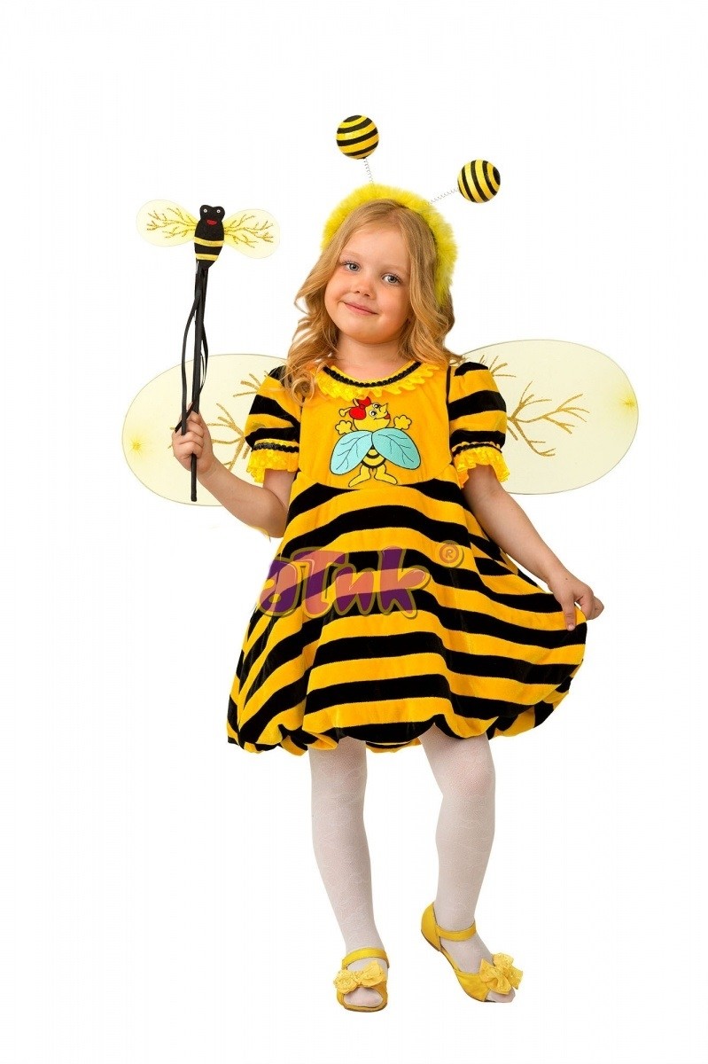 Костюм пчелки для девочек - черно-желтый костюм, выполненный из бархатного материала. Костюм включает в себя платье с пышной черно-желтой полосатой юбкой и желтой вставкой на груди с изображением пчелки. Платье с полосатыми рукавами-фонариками. Также в комплект входит ободок с опушкой и рожками, желтые сетчатые крылышки с золотистыми узорами, а также палочка, украшенная черными ленточками и пчелкой.