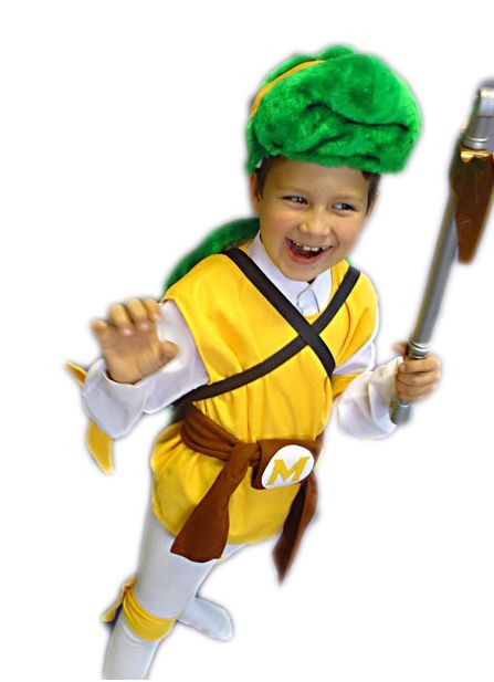 Детский костюм черепашки Микеланджело - костюм веселой ниндзя Черепашки, который включает в себя желтую кофту без рукавов, желтые повязки на ноги и руки, коричневый пояс с желтой буквой M, а также маску-шапку в виде мордочки черепашки. На глазах желтая повязка. Также в комплекте имеется меховой зеленый панцирь на черных ремешках.