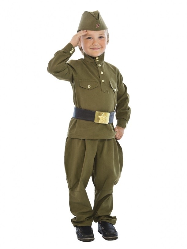 Военный комплект детский - идеальный костюм к празднику День Победы. Костюм выполнен из хлопчатобумажного материала. В комплект входит гимнастерка, брюки-галифе, которые слегка собраны по талии. Дополняет комплект черный пояс с металлической золотистой бляхой и пилотка со звездочкой.