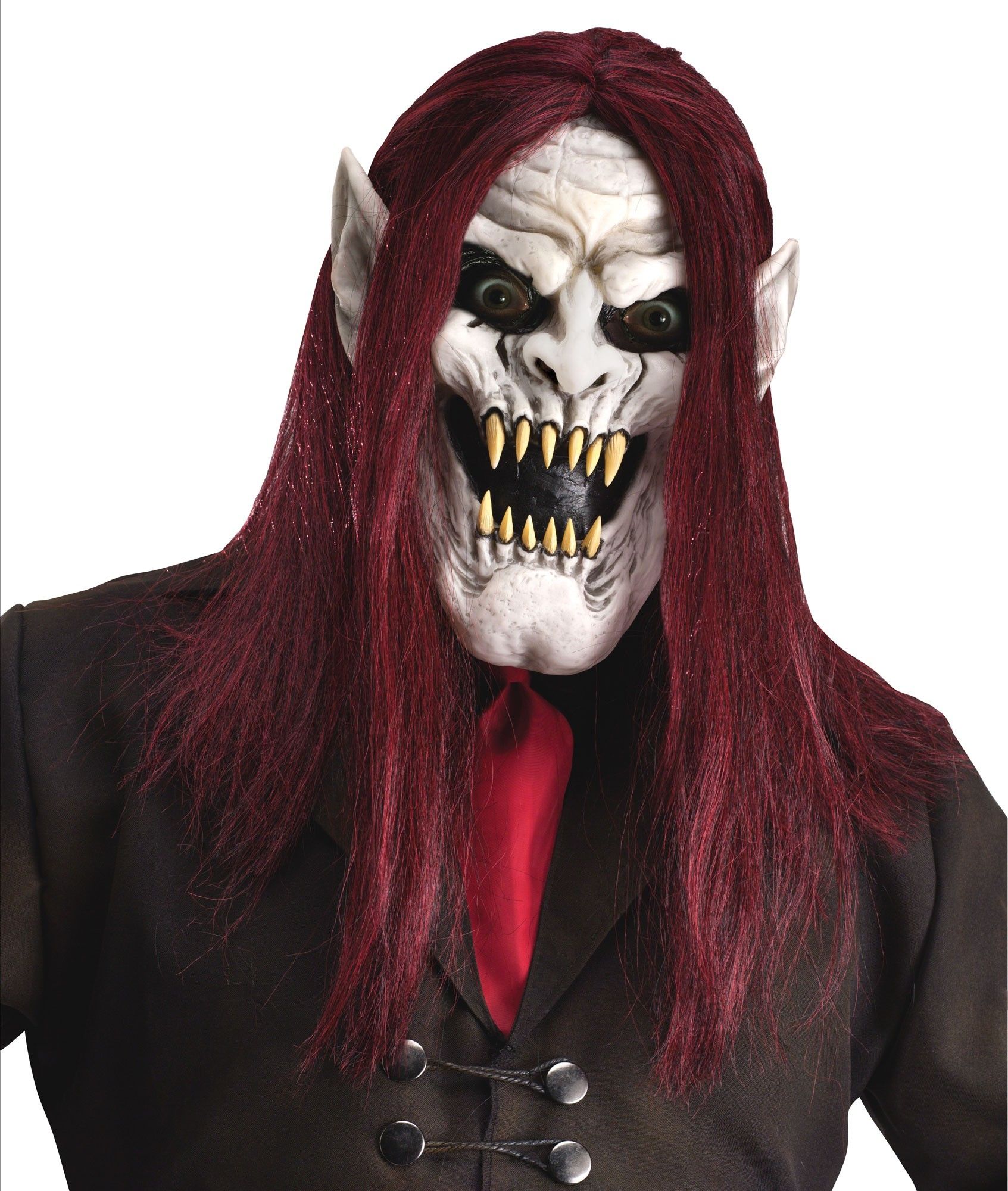 Маска демонического вампира белая - это жуткая маска, выполненная из белого латексного материала. Ужасный желтый оскал, острые уши и множество глубоких морщин - все это создает пугающий образ вампира. К маске прикреплены длинные волосы красного цвета.