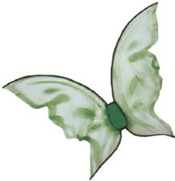 Яркие зеленые крылья бабочки - это узорчатые большие крылья, выполненные из легкого тонкого материала. У крыльев неровные узорчатые края, а также они украшены различными узорами чуть более темного цвета, чем крылья. По середине имеется пышная вставка из рюш.