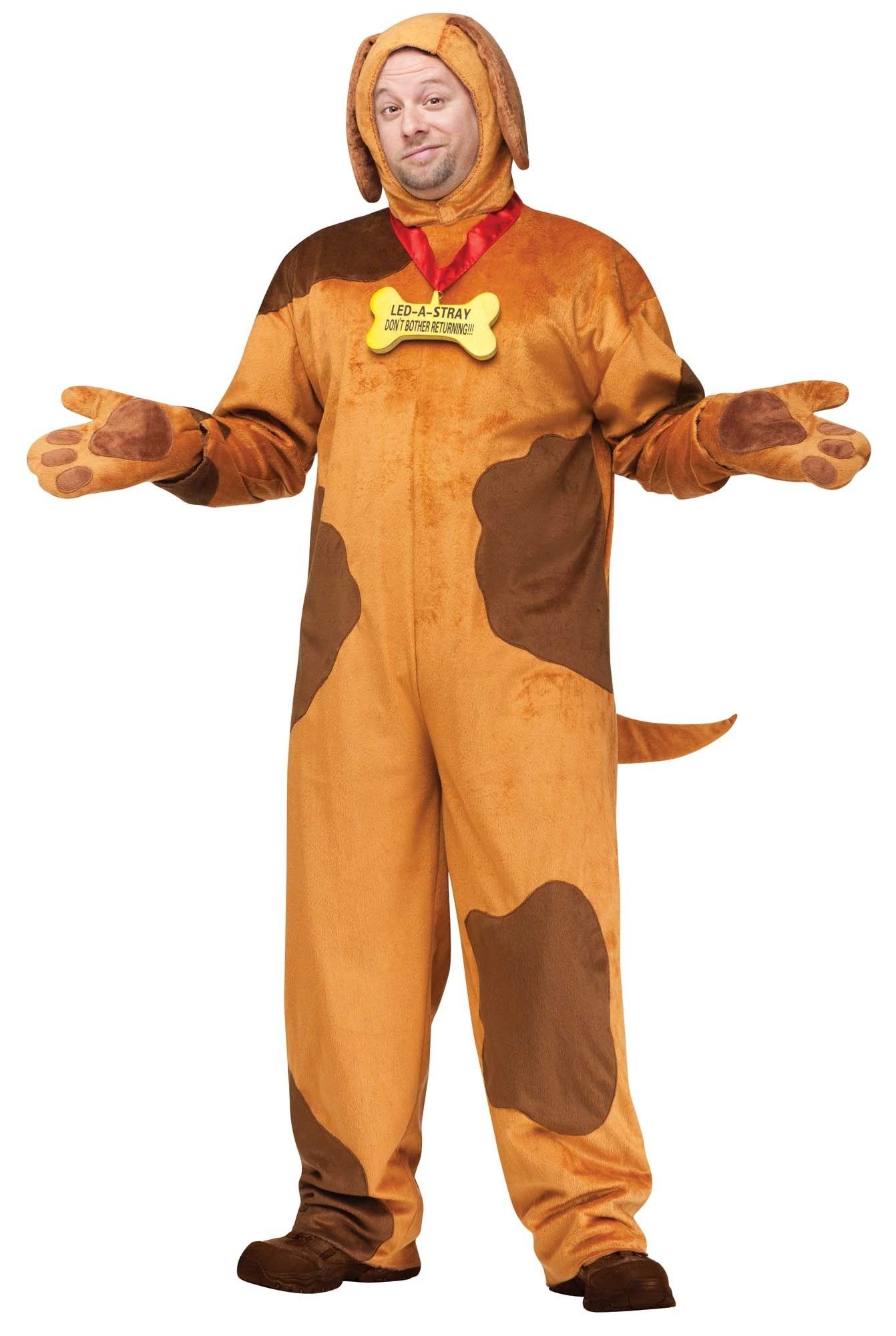 Костюм заблудившейся собаки включает в себя плюшевый комбинезон с прикрепленным длинным хвостом. Комбинезон выполнен в коричневом цвете с пятнами в более темном тоне. Также в комплект входит капюшон с ушами, варежки и кость-значок, на которой имеется надпись "Заблудившийся! Не беспокоиться о возвращении!!!!"