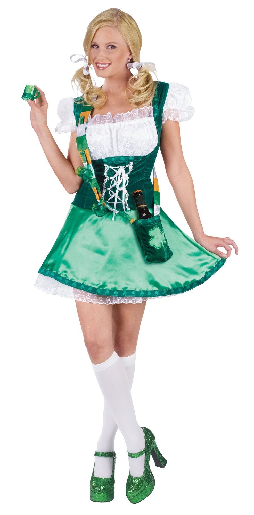 Костюм милой Лэсси официантки выполнен в красивом зеленом цвете. В комплект входит милое платье с атласной юбочкой и бархатным корсетом под грудь на шнуровке. Лиф выполнен из белого ажурного материала. В комплект костюма также входит бархатная зеленая сумочка для бутылки и рюмочек, а также три зеленые мини-кружки из пластмассового материала. Гольфы и туфли в комплект не входят.