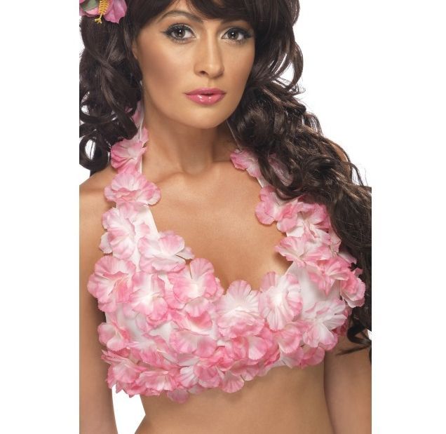 Гавайский цветочный топ выполнен в розовом цвете из искусственных цветов. Этот нежный красивый топ прекрасно дополнит гавайские юбки, к нему также можно подобрать украшения. Топ станет прекрасным вариантом для пляжных вечеринок.