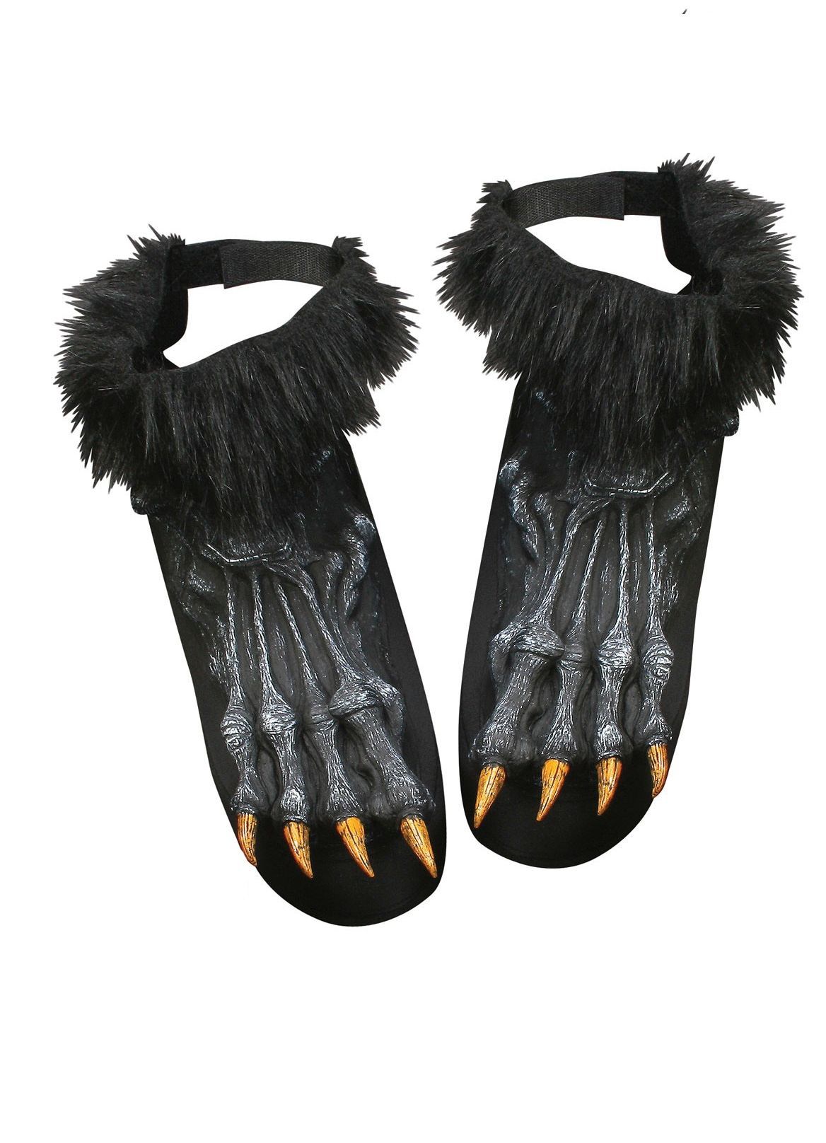 Лапы оборотня черные - это накладки на обувь которые закрепляются резинкой вокруг щиколотки. Накладки выполнены из черного материала, сверху которого имеются латексные костлявые лапы с длинными острыми когтями. Верхняя часть покрыта черным искусственным мехом. Сделайте свой образ еще более пугающим!