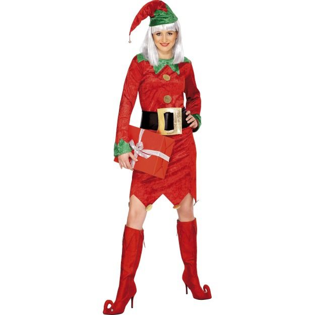 Новогодний костюм Эльфа женский выполнен из велюрового материала. В комплекте костюма имеется красное платье с зеленым воротником и манжетами, черный широкий пояс с бляшкой золотого цвета, а также красный колпак с зеленым подворотом. Для завершения образа вы можете подобрать подходящую обувь.