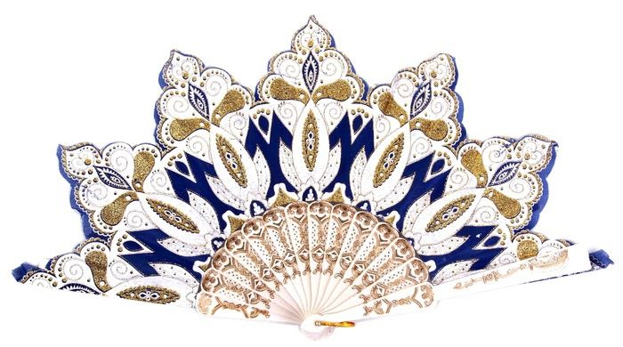 Китайский синий веер - это изящный узорчатый веер, который сочетает в себе синий, золотистый и белый цвета.