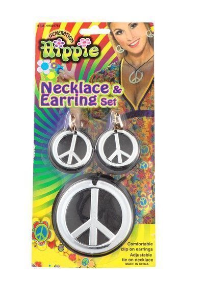 Набор для хиппи выполнен в серебряном цвете. В комплекте набора имеется ожерелье в виде значка хиппи на черной веревке, а также сережки. Такой набор станет последним штрихом в образе хиппи.(Прочие аксессуары для дополнения образа вы также найдете в нашем каталоге).Рекомендации по уходу: Только чистка по месту загрязнения.