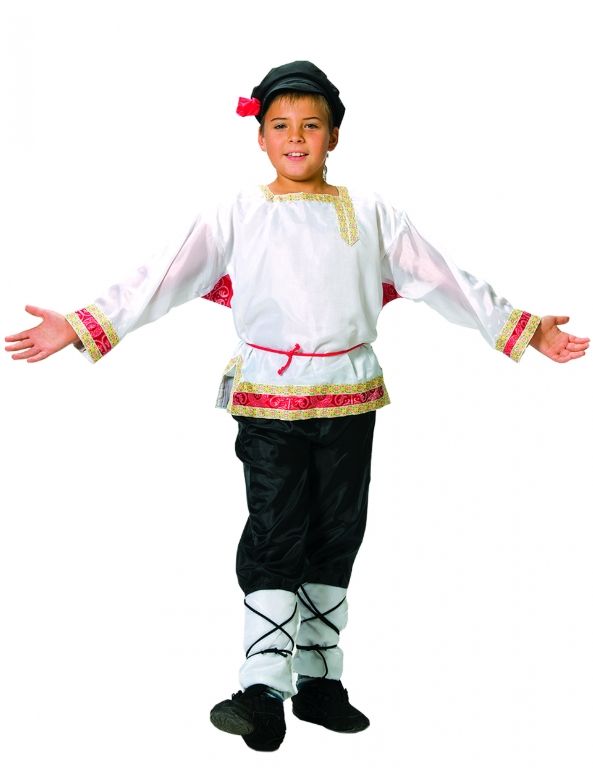 Детский костюм Иванушки включает в себя белую рубашку с узорами в старорусском стиле, черные брюки, красный тонкий пояс, а также черный картуз.
