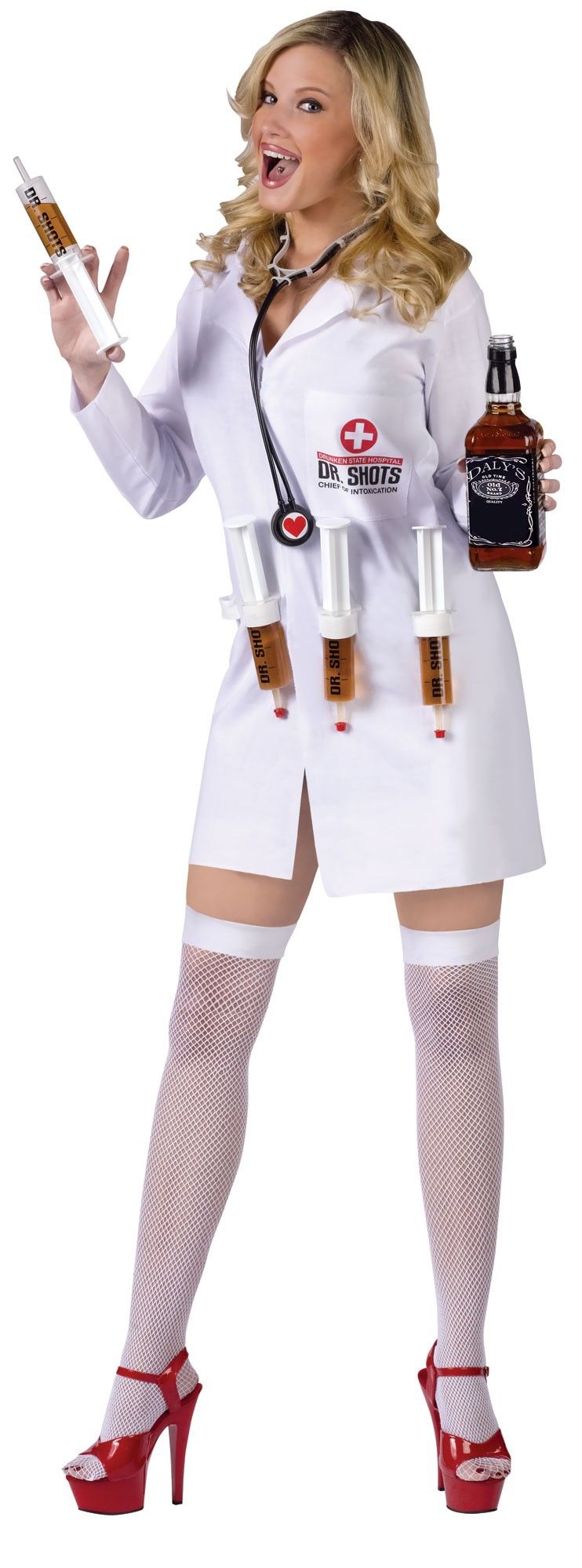 Костюм секси докторши включает в себя белый медицинский халатик с длинным рукавом, черный стетоскоп с изображением в виде сердечка, а также четыре шприца-рюмки с надписью "DR. SHOT". В эти шприцы можно набирать любые алкогольные и безалкогольные напитки.