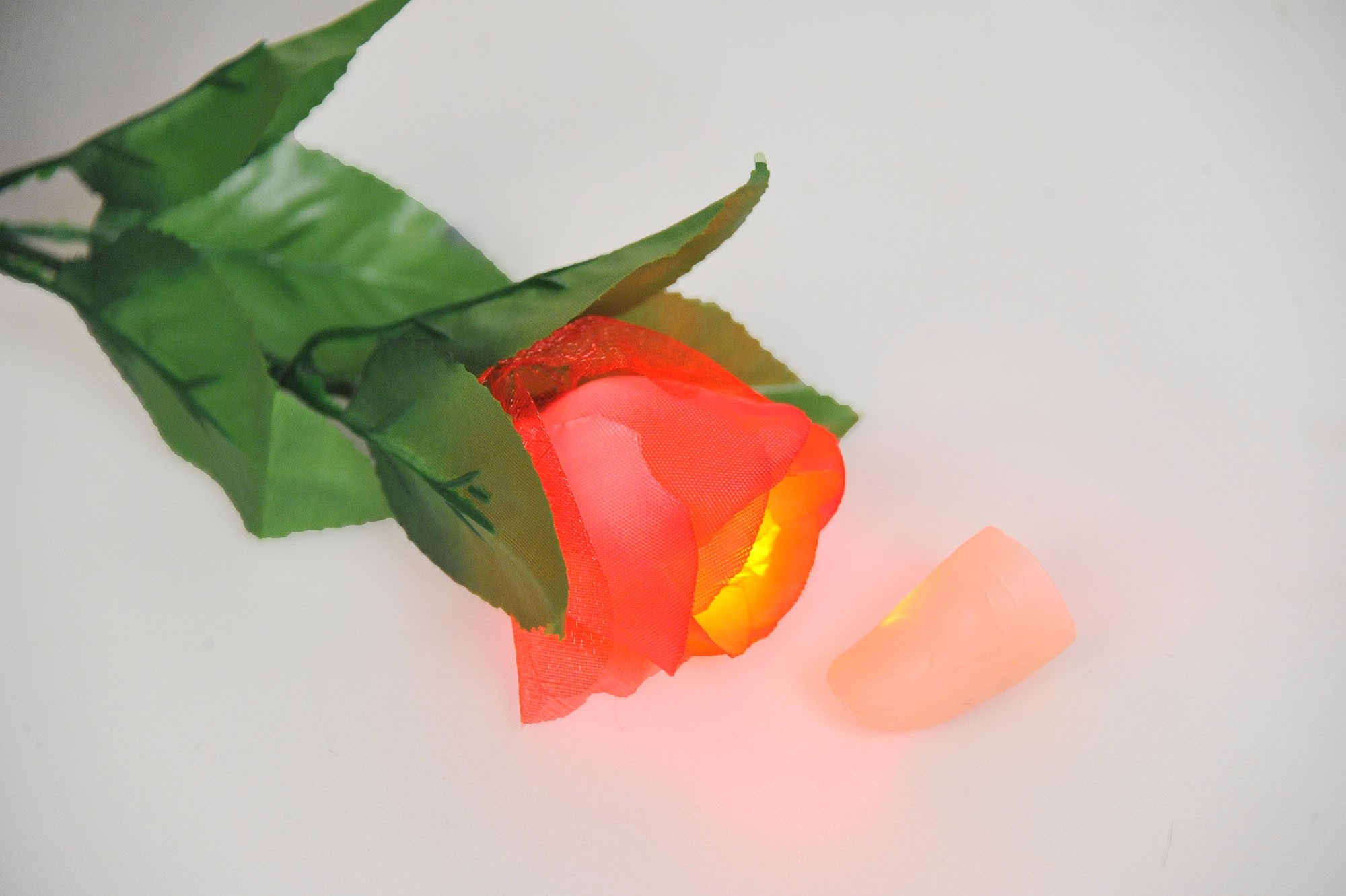 Набор фокусника Волшебная роза включает в себя искусственную красную розу, а также накладку на палец.