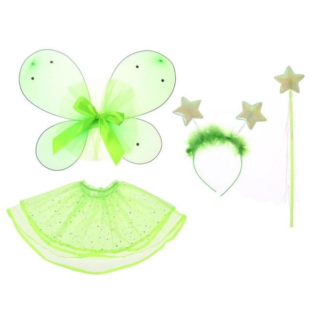 Детский набор зеленой бабочки - отличный вариант для утренника и других детских праздников. Костюм включает в себя нарядные крылышки с бантиком, пышную юбочку, украшенную блестками, ободок со звездочками на усиках и волшебную палочку.