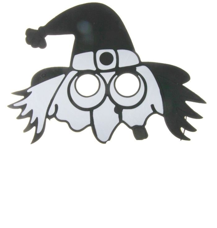 Маска ведьмочки серая в черной шляпе. Маска сделана из мягкого пластика и имеет размер 17х21 см.