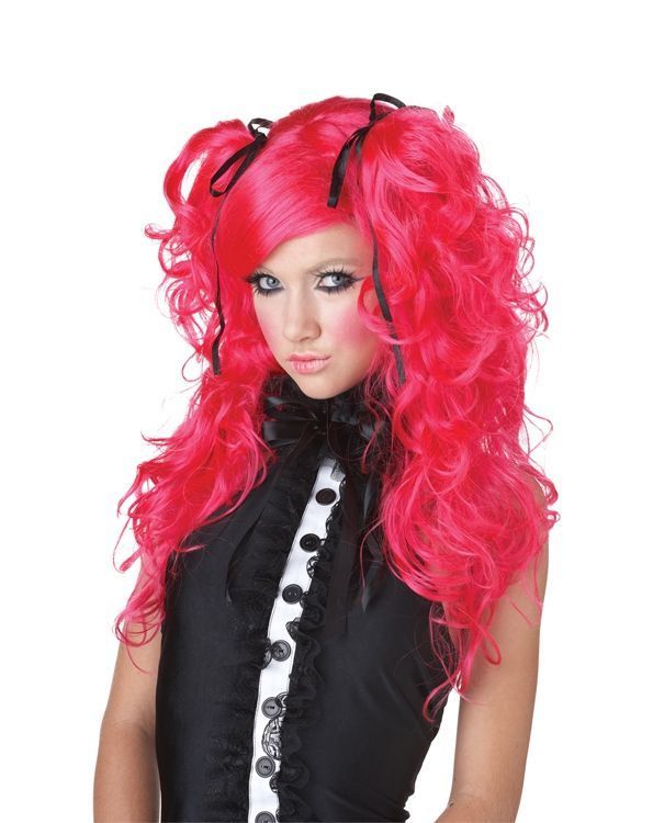 Розовый парик куколки выполнен из синтетических волокон, окрашенных в ярко розовый цвет. Имеются две чёрные ленточки. Такой парик станет прекрасным дополнением к костюмам куколок.