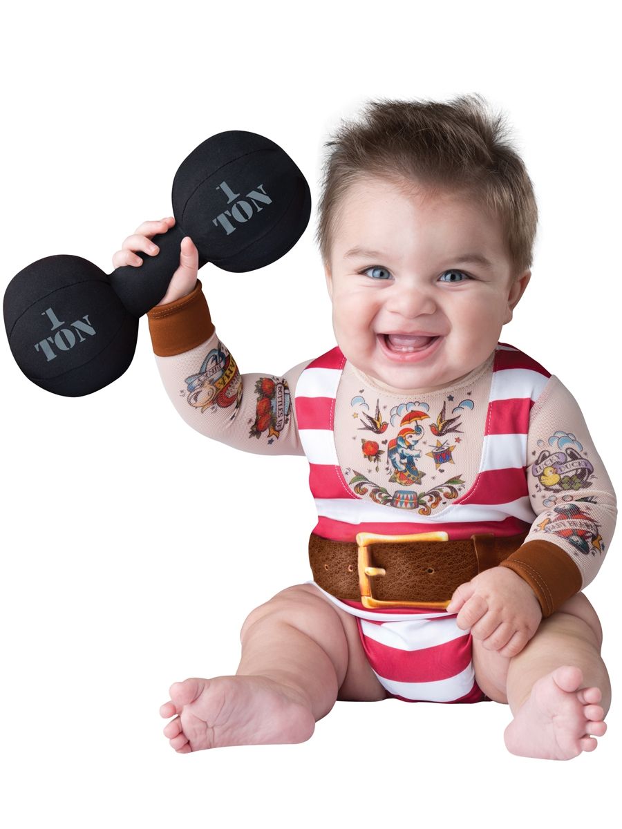 Костюм сильного малыша представляет собой комбинезон, имитирующий голое тело с татуировками с полосатым комбинезоном без рукавов. Застегивается на кнопки для легкой смены подгузников.