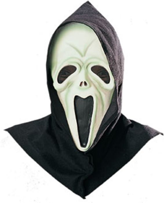 Белая маска с потрясенным выражением лица Крика. К маске прикреплен черный капюшон.