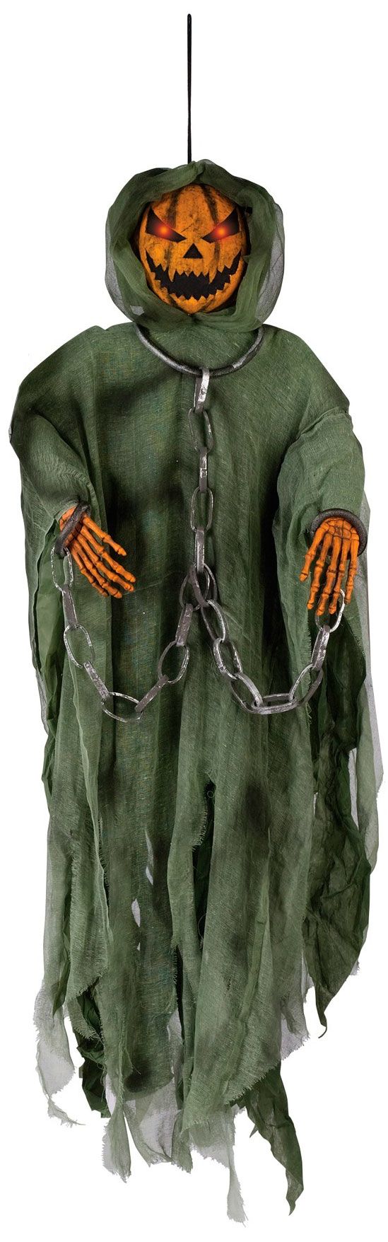 Подвесная фигура тыквы в зеленном плаще станет самой жуткой декорацией на вашей вечеринке! Тыква одетая в зеленый рваный плащ с капюшоном приведет в ужас любого! На шее и руках одеты круглые кандалы, соединенные между собой цепью. У этой фигуры светящиеся глаза.