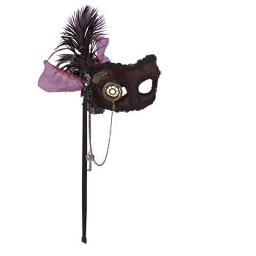 Маска венецианский стимпанк - это маска на глаза с черным длинным держателем, выполненная в темных тонах. Маска украшена большим пером и бантом.